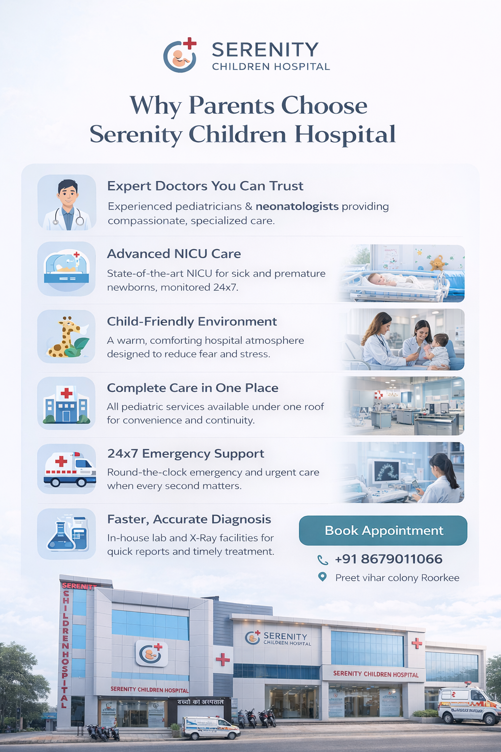 At Serenity Children Hospital, we strive to create an environment where parents feel confident, informed, and reassured, and where every child receives the attention and compassion they deserve.”